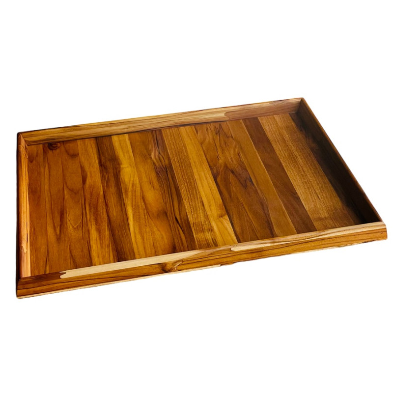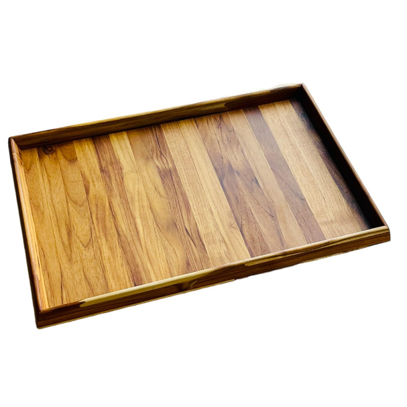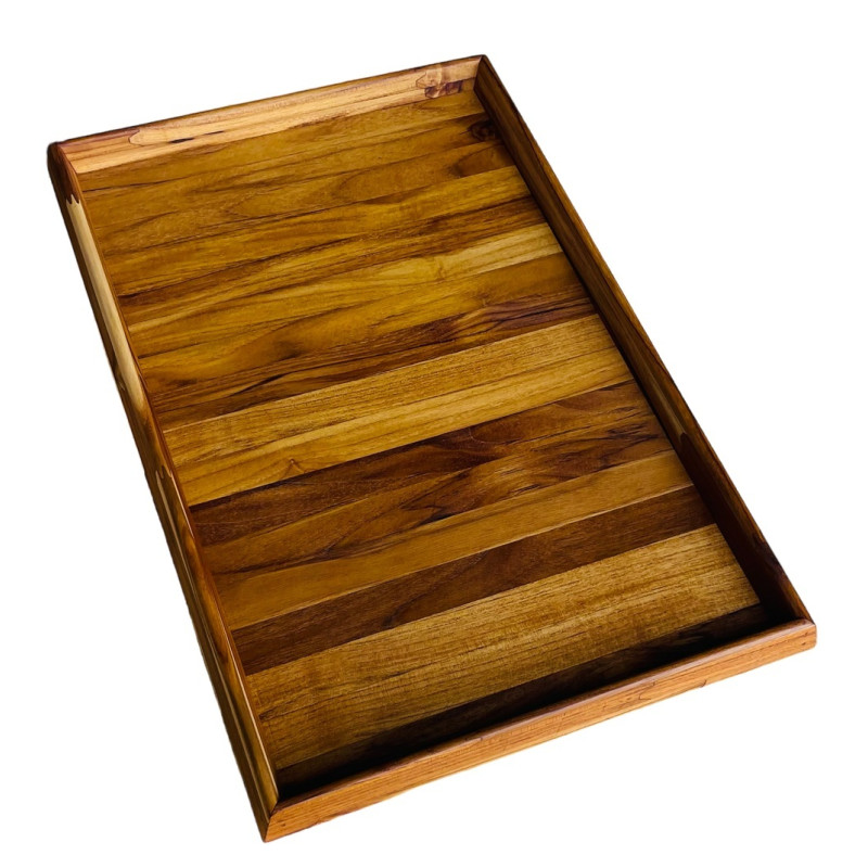 Bandeja bisotê 100% em madeira teca, disponível em três tamanhos. Ideal para servir com elegância em buffets, cafés da manhã e ambientes sofisticados.