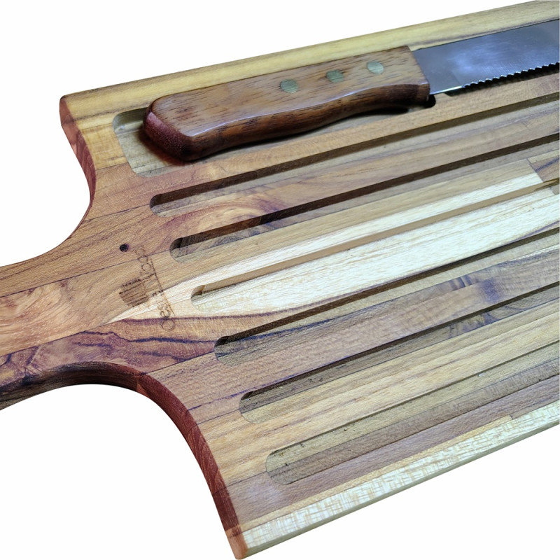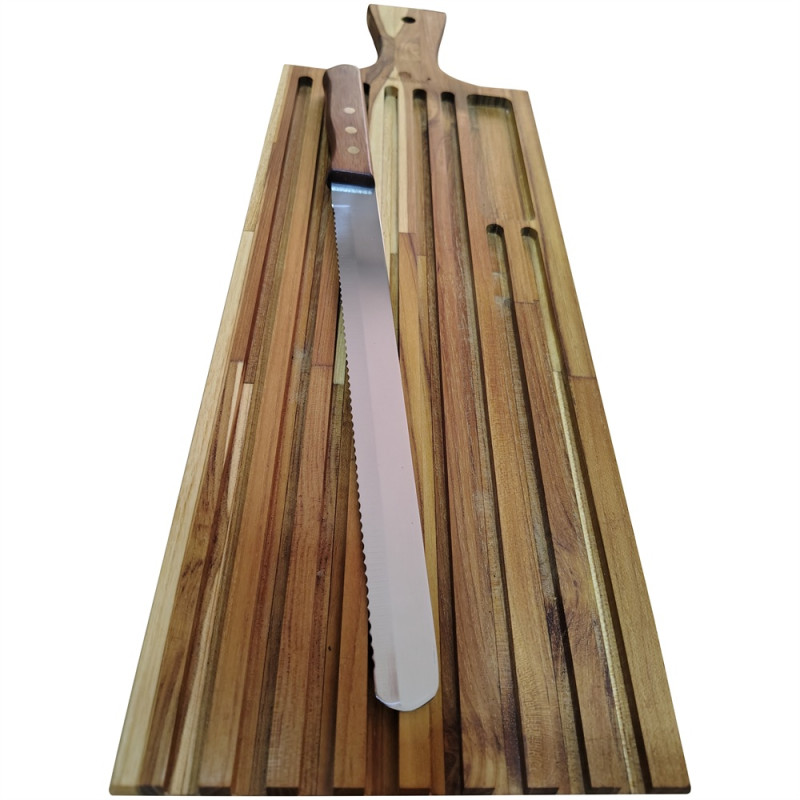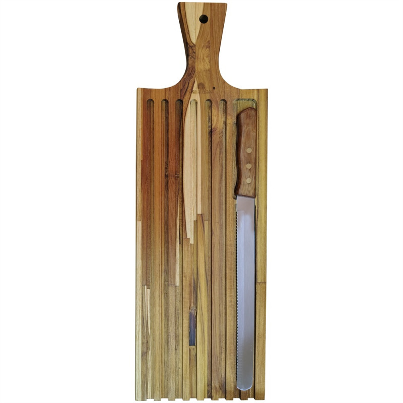 Tábua migalheira em madeira teca com bandeja coletora e faca de pão, ideal para servir com elegância