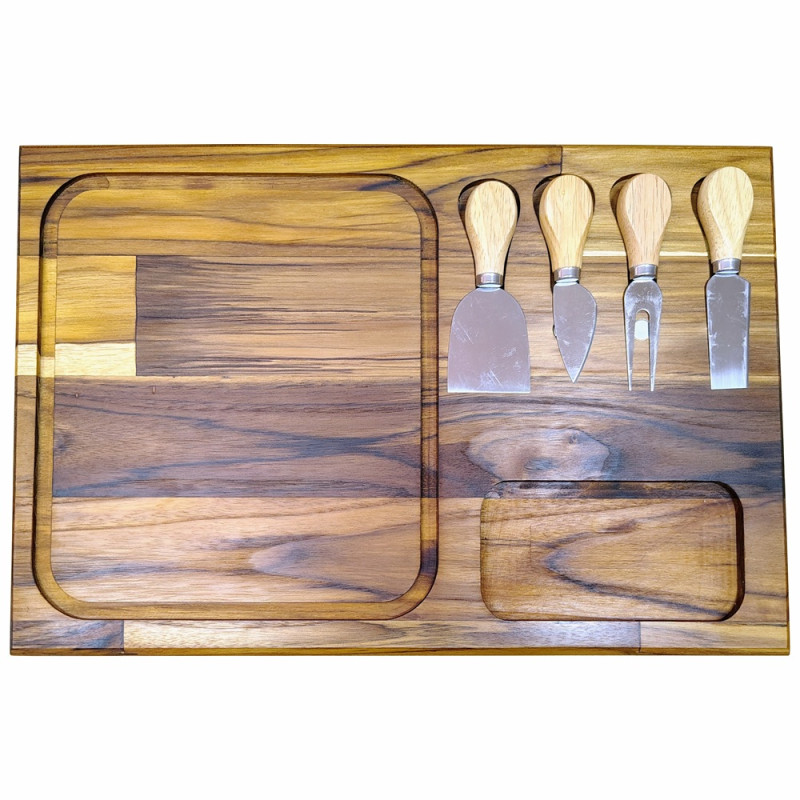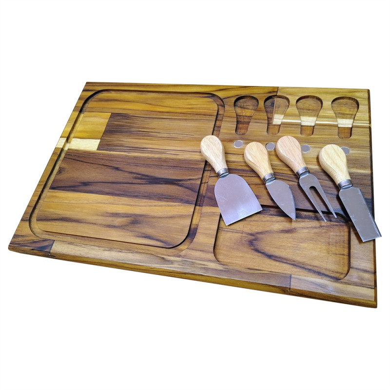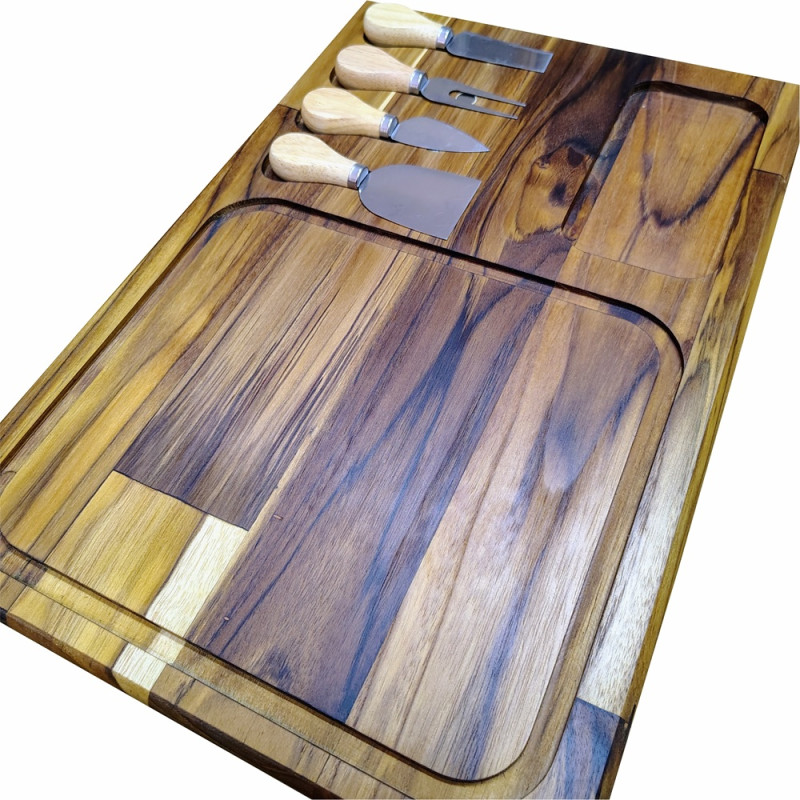 Tábua de queijos gourmet em madeira teca com garfo, espátula e facas em inox com cabo de madeira
