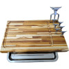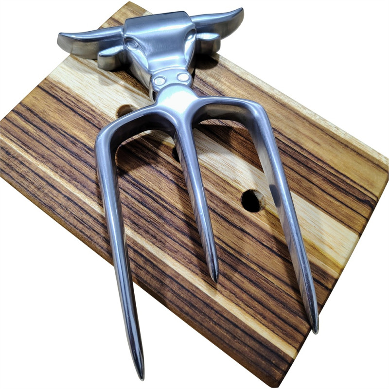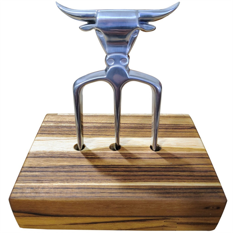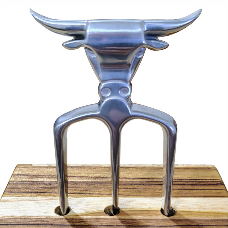 Tridente Boi em alumínio maciço com suporte em madeira teca — ideal para churrasqueiros que valorizam estilo, segurança e resistência térmica.